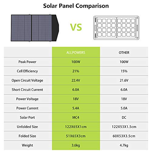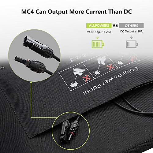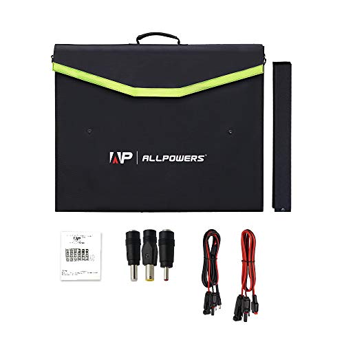 - ▶ 【Contenido del paquete】: Cargador solar plegable ALLPOWERS 100W, cable MC-4 a 5.5x2.5mm, cable MC-4 a Anderson, adaptador DC de 8mm, cable 3.5x1.35mm, cable DC 5.5x2.1mm, manual de instrucciones, 18 meses de garantía y amigable Servicio al Cliente