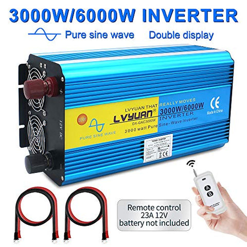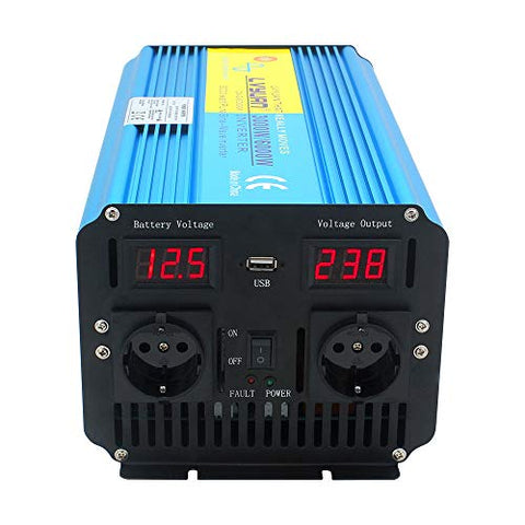 - Inversor realmente potente: Frecuencia sinusoidal pura de 12V a 230V. Salida de potencia continua: 3000W. Tensión o potencia máxima: 6000W.