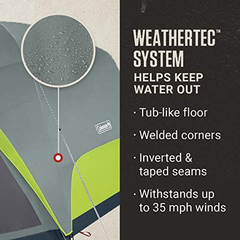 - Protección contra la intemperie: el sistema WeatherTec utiliza un suelo similar a la bañera, esquinas soldadas patentadas, mientras que las costuras invertidas y las costuras selladas en el cuerpo de la tienda de campaña ayudan a mantener el agua fuera; marco duradero está probado para soportar vientos de hasta 35 mph