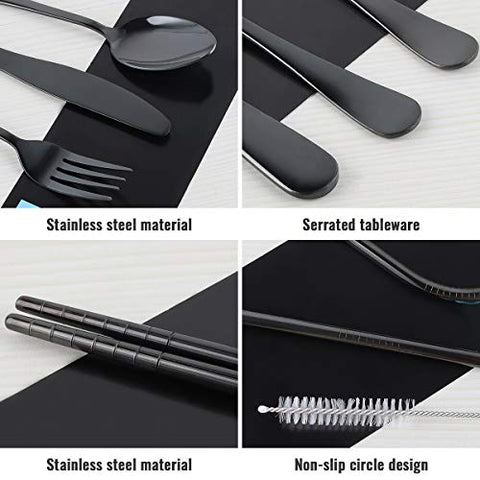 - 【SET JUEGO DE CUBIERTOS MULTIFUNCIONAL】: Este juego incluye todos los productos que necesita. Puede usarlo para cortar alimentos, comer pasta, tomar sopa, beber jugo, comer clip, y este juego de cubiertos puede combinar con cualquier tipo de vajilla, le permite disfrutar de cada comida en el interior o al aire libre durante su viaje.