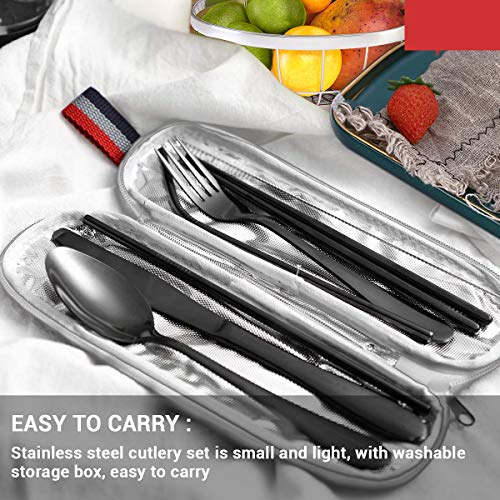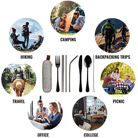 - 【FÁCIL DE LLEVAR】: Nuestro juego de cubiertos de acero inoxidable es pequeño, liviano y fácil de llevar. Y viene con una caja de almacenamiento lavable para un fácil almacenamiento en una bolsa o mochila. Es imprescindible para el uso diario, para acampar y cocinar al aire libre, caminatas, picnics, viajes familiares y cenas mientras viaja.