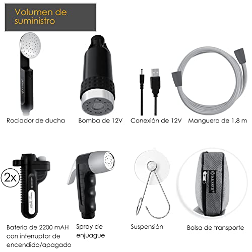 Detalles: Con esta ducha móvil de camping recargable KESSER con bomba recargable, podrás ducharte donde quieras, limpiar el coche, duchar a tu perro en el jardín o tenerlo a la mano para pequeños trabajos de limpieza, por ejemplo, durante el campamento, senderismo, surfeo u otras actividades: a partir de ahora, siempre tendrás tu ducha contigo. DESCRIPCIÓN DEL PRODUCTO: • incl. 2 baterías • Incluye 2 duchas, 1 ducha de enjuague, 1 ducha de chorro • Con bolsa de transporte • Bomba sumergible con batería recargable• integrada, sin necesidad de conexión a la red eléctrica • Alimentación por batería: aprox. 60 min• No es necesaria una conexión de alimentación fija • Línea de suministro: 4,5 l/min • Longitud de la manguera: aprox. 180 cm • Longitud del cable de carga USB: 60 cm • Conexión de alimentación: 5 voltios (USB). Datos técnicos: • La capacidad de la bomba es de aproximadamente 4,5 l/minuto • Tipo de batería: de iones de litio • Capacidad de la batería: 2200 mAh • Tensión de la batería: 3,7V • Opción de carga: salida USB 5V/1,2A • Tiempo de carga: 2-5H (dependiendo del cargador). Alcance de entrega: • Set de ducha para camping • 1 ducha con rociador • 1 spray de aclarado • 2 baterías • 1 cable (USB) • 1 bomba de 12V • 1 percha más soporte • 1 bolsa de almacenamiento • 1 ventosa • 1 instrucción de montaje