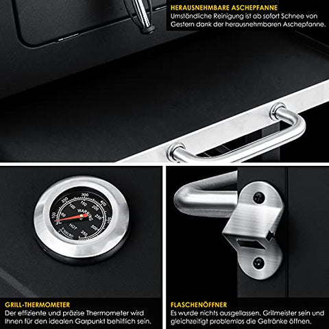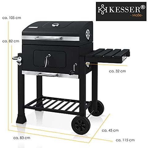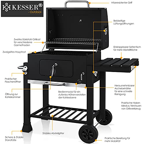 - 𝐀𝐂𝐂𝐄𝐒𝐎𝐑𝐈𝐎𝐒: el carro de la barbacoa de carbón de KESSER está equipado con un amplio espacio de almacenamiento para colocar los utensilios de la barbacoa, la comida de la barbacoa o los accesorios de la barbacoa, para que siempre tengas todo a tu alcance. Para que la fiesta de la barbacoa sea perfecta, también lleva integrado un abridor de botellas para una cerveza fría. Las pinzas y el cepillo de la parrilla se pueden colgar en los ganchos de los cubiertos.