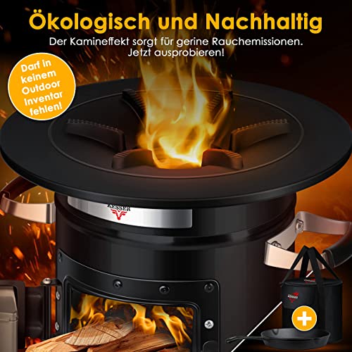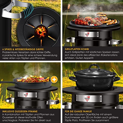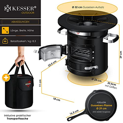 - Fácil de usar: Fácil de usar: gracias a su tamaño optimizado para el transporte, puedes utilizar el horno Rocket Stove donde quieras. Caliéntate o utiliza el hervidor como una hoguera de alta eficiencia para tu juego de ollas de hierro fundido de Kesser. - La sartén incluida de hierro fundido duradero completa el horno en su función de cocina pequeña. Pero también como fuente de calor y luz en caso de corte de energía, nuestra barbacoa es un fiel compañero.