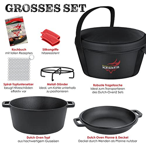 - 𝐈𝐍𝐓𝐄𝐑𝐈𝐎𝐑 𝐘 𝐄𝐗𝐓𝐄𝐑𝐈𝐎𝐑: Con el juego de ollas holandesas de KESSER estarás óptimamente equipado para tu próxima experiencia al aire libre, ya que con el juego de alta calidad hecho de hierro fundido podrás preparar deliciosos platos incluso con una llama abierta. Pero también en la zona interior puedes conjurar deliciosos manjares en tu cocina.