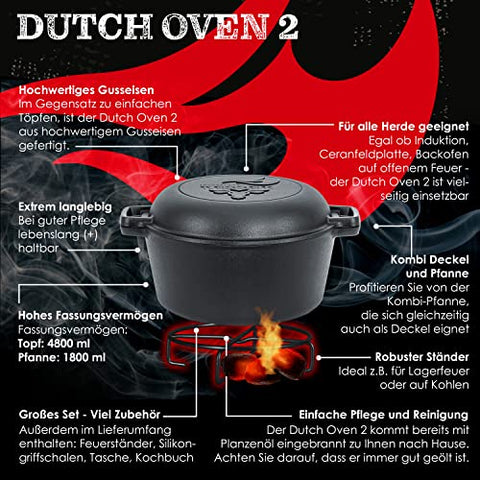 Detalles: KESSER 2 en 1, el horno holandés BBQ de hierro fundido con atizador es resistente al calor. Cuenta con tapa con asa de transporte, 4,8 l de capacidad en la olla y 1,8 l en la sartén (la tapa puede usarse como sartén), sin revestimiento químico. Incluye con libro de cocina Ya no es una olla de los tiempos de los pioneros, sino un verdadero talento multifuncional para los cocineros modernos de hoy en día, y los maestros de la parrilla. Descripción del producto: • Especialmente resistente al calor • Alta calidad gracias a una producción estable y segura con hierro fundido duradero • Alta capacidad • Protección contra quemaduras • La tapa puede utilizarse como sartén • Sin revestimiento químico • Asa con muesca para colgar • Con asa de transporte • Móvil y portátil gracias a la bolsa de transporte Detalles técnicos: • Capacidad de la olla: 4,8 l • Capacidad de la tapa: 1,8 litros • Maceta de altura: 12 cm • Diámetro de la tapa de la olla: 26 cm • Diámetro de la olla en el fondo: 24 cm • Altura de la tapa: 5 cm • Diámetro de la tapa superior: 27 cm • Diámetro de la tapa en la parte inferior: 21 cm Alcance de la entrega: • 1 horno holandés para barbacoa 2 Kesser • 1 libro de cocina • 1 tapa 2 en 1 (puede utilizarse como sartén) • 1 soporte metálico • 1 trébol en espiral • 1 asas de silicona • 1 bolsa de transporte robusta • 1 manual de instrucciones