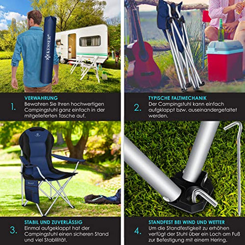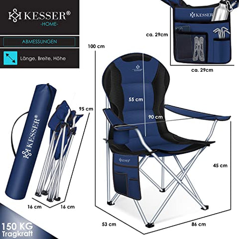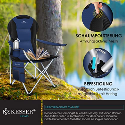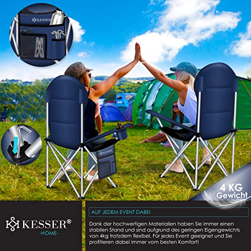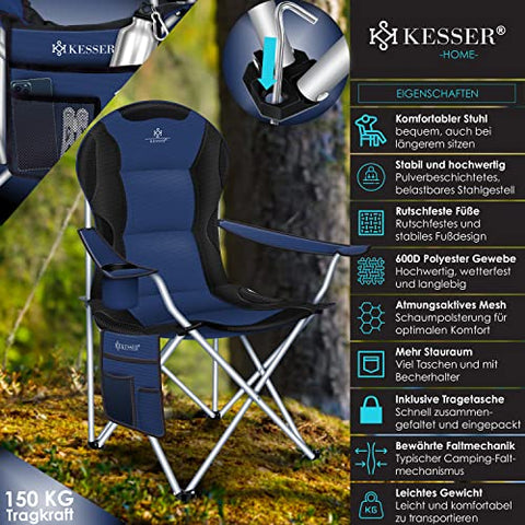 - Nuestra silla de camping premium de la casa KESSER es un mueble de alta calidad para su uso en camping, jardín o incluso en festivales. La silla plegable no solo es cómoda, sino que también es extremadamente estable y duradera. El uso de materiales de alta calidad y el procesamiento preciso hacen de esta silla plegable un compañero fiable para todas las ocasiones.
