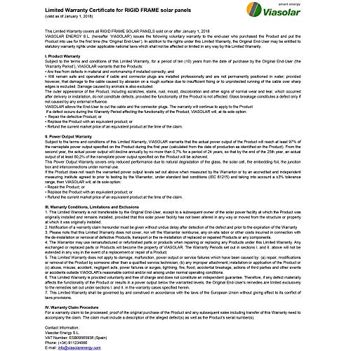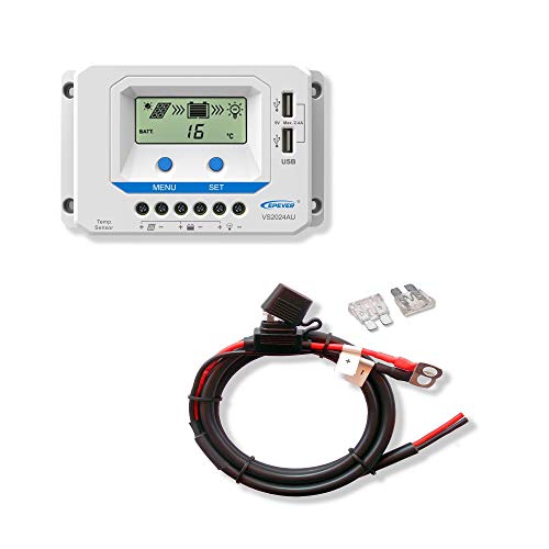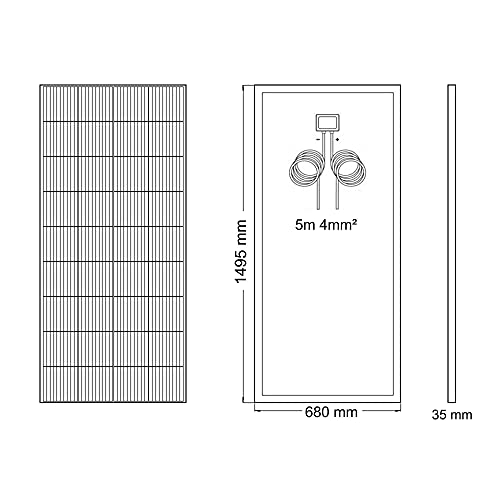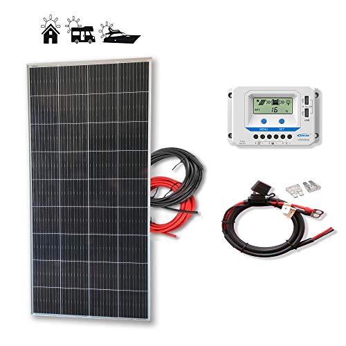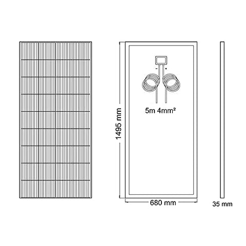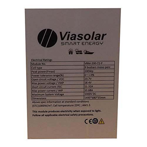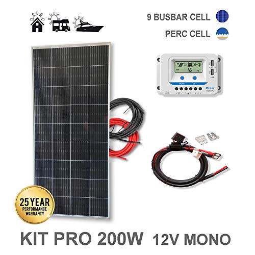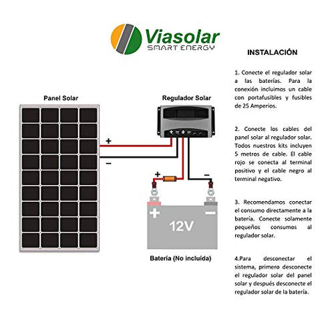 Detalles: Kit 200W PRO 12V panel solar placa monocristalina células PERC de alta eficiencia Composición del Kit Solar: Panel solar 200W monocristalino 12V tecnología PERC alta eficiencia con cable de 5 metros Regulador solar de 20A 12V/24V con display y 2 USB LCD VIASOLAR Cable de 150 cm para conexión entre regulador y batería con portafusibles y 2 fusibles de 25 A incluídos Especificaciones técnicas:Panel solar 200W monocristalino 12V tecnología PERC alta eficiencia con cable de 5 metros Cell Size: 156mm 9 busbar monocrystalline perc Module Dimension: 1480mmx680mmx35mm No. of Cells: 36 Weight: 11 kg Junction Box: IP67 Rated, with bypass diodes Cable length: 5 m; 4 mm2 No. of Mounting holes: 4 (1000W/m²; 25ºC;AM1.5) Max System Voltage: 1000 V Maximum Power Pmax: 200 W Voltage at Maximum Power Point Vmpp: 19.3 V Current at Maximum Power Point Impp: 10.36 A Open Circuit Voltage Voc: 23.1 V Short Circuit Current Isc: 11.32 A Regulador solar de 20A 12V/24V con display y 2 USB LCD VIASOLAR Rated Voltage: 12V/24V auto Rated Current: 20A Standby Current: <10mA Float voltage: 13.7V (default value, adjustable) Discharge cutoff voltage: 10.7V (default value, adjustable) Discharge recovery voltage: 12.6V (default value, adjustable) USB output: 5V/2.5A Working Temperature: -35°C to +60°C Dimensions: 145*74*34mm Weight: 168g Cable de 150 cm para conexión entre regulador y batería con portafusibles y 2 fusibles de 25 A incluídos