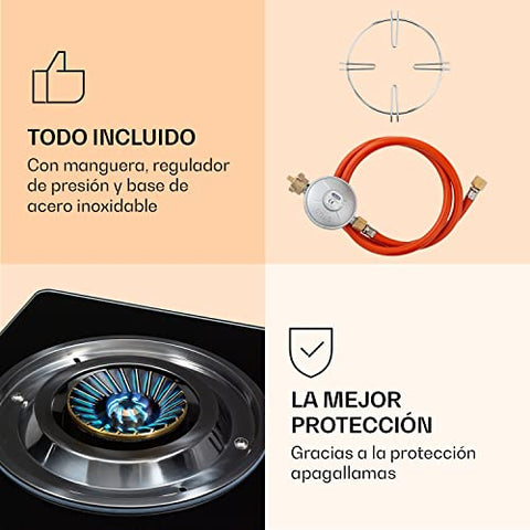 - FÁCIL DE USAR Y SEGURO - Esta cocina portátil es fácil y segura de usar. Cuenta con 2 mandos giratorios de funcionamiento, un tubo para el gas y un supresor de llamas integrado que reduce la presión durante la cocción y te ofrece mayor protección.