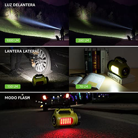 - 【4 LUCES DE ALUMBRADO Y 1 LUZ DE ADVERTENCIA】: La linterna frontal recargable de mano está disponible en dos niveles de brillo diferentes para la luz principal (1000LM/280LM) y la luz lateral (150LM/70LM). En el otro lado de la carcasa hay una luz roja brillante que atrae la atención en caso de emergencia.