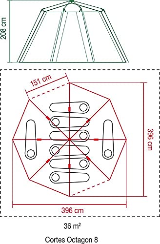 Detalles: The cortes Octagon 8 Green provides a Full 360 ° View of Your surroundings. amplio Living space and the Ingenious Hinged Door Gives it a homely Feel on the Campsite. This Spacious Tent has a multitud of uses, it can be Dressed as Luxury glamping Bedroom, a Playroom for the Kids or a perfect Tent for Festival Gatherings. the Tent Comes With a Wheeled Carry Bag and packs Down compactly for easy Transportation and Storage. Features and Specification capacity: 8 Persons Rooms: None Sleeping Area: 15,7 M² Living area: – M² total Area: 15,7 M² Set Up: Inner First Poles: Steel suelo: PE Integrated Fabric: Poliéster, PU coated costuras: costuras selladas Carry Bag: included Pack Size: 85 x 30 x 30 cm Weight: 20,7 kg Water Column: 2000 mm Weather Tech offers Comfort and Protection well Enjoying the Outdoors Meaning This Tent Is impermeable Hinged Door means its Easy to get in and Out of the Tent Fire Retardant < >