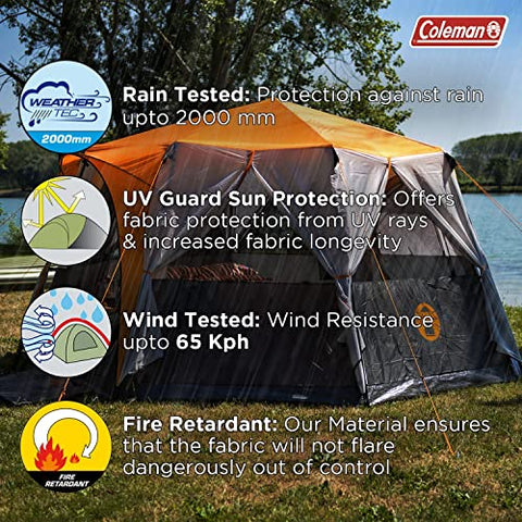 - 100% impermeable: Gracias al sistema Weather Tec de Coleman, 2000 mm de columna de agua en combinación con las costuras selladas y el suelo totalmente integrado, se mantendrá seco en cualquier clima