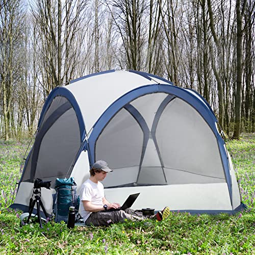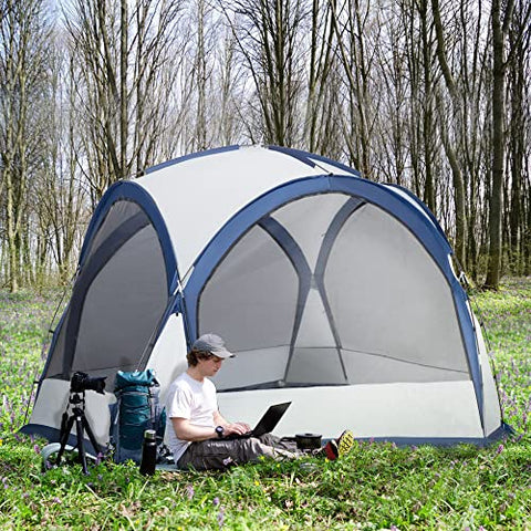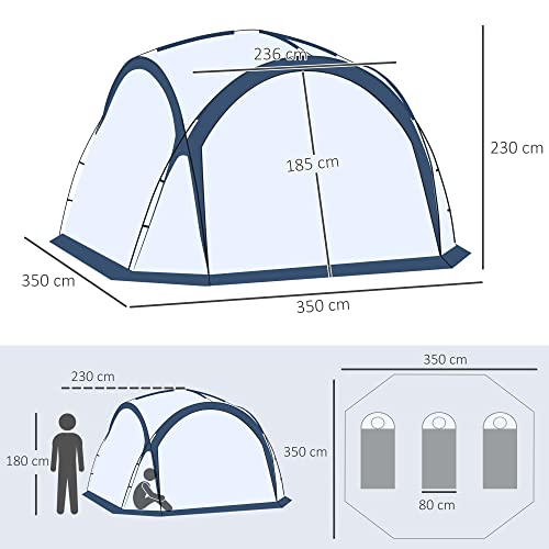 Detalles: Disfruta acampando en espacios permitidos o en tu parcela de camping con esta tienda de campaña portátil de Outsunny para 6-8 personas. Equipada con 4 puertas con cremallera y mosquiteras que dejan pasar el aire y evitan la entrada de insectos. Una capa exterior de tejido Oxford con revestimiento de PU te protege de los rayos UV. La carpa se puede transportar fácilmente gracias a la bolsa incluida. Y viene con piquetas y cuerdas de tensión para fijar firmemente en el suelo.Características:● Para 6-8 personas● 4 puertas de malla mosquitera transpirable con cremallera● 2 paneles de tela Oxford extraíbles para aportar privacidad● Gancho superior interno para poder colgar una luz de camping● Correa de 2 cm de ancho para apretar las cuatro esquinas● Estructura resistente con postes de acero y fibra de vidrio● Incluye bolsa de transporte y 12 piquetas de suelo● Se requiere montaje● Nota Importante:No realizamos envíos a las Islas Canarias, Ceuta y Melilla, ni a las Azores y otras islas de PortugalEspecificaciones:● Color: blanco y azul● Materiales: tejido de nailon 190T, tela Oxford de 210D y fibra de vidrio● Medidas totales: 350x350x230 cm (LxANxAL)● Medidas de cada lado: 236x185 cm (LxAL)● Carga máxima del gancho: 1 kg● Referencia: A20-232- 1 x Tienda de campaña- 12 x Estaca de suelo- 4 x Cuerda de tensión- 1 x Bolsa de transporte- 1 x Manual de instrucciones