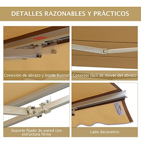 Detalles: ¿Quieres tener sombra en tu terraza, jardín o balcón? Este toldo es ideal para proporcionarte sombra en el espacio que más desees. Gracias a su optimizada estructura lo puedes instalar fácil i rápidamente en cualquier lugar de tu casa. Está fabricado con material de alta calidad que garantiza su resistencia a la intemperie. Viene equipado con una manivela manual para abrir y cerrar fácilmente. Este toldo plegable es el complemento ideal para proporcionarte funcionalidad y darle un toque decorativo a tu hogar.