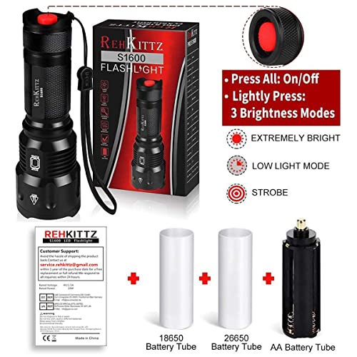 - 【CONTENIDO DEL PAQUETE】1 linterna LED S1600 + 1 soporte de batería AA +1 tubo de batería 18650 (baterías no incluídas) + 1 tubo de batería 26650 (baterías no incluídas) + 1 Guía de manejo.