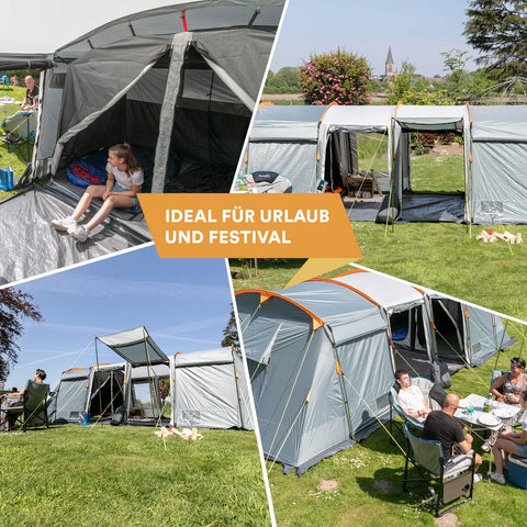 El suelo de la tienda de campaña para la sala de estar tiene la forma de bañera para mantener alejada la humedad y proporcionar más comodidad. Está fabricada con material ignífugo y resistente a la intemperie con columna de agua de 5000 mm y costuras selladas de alta calidad. El montaje es rápido y sencillo y viene con una robusta bolsa de transporte, clavijas y instrucciones de montaje en francés, alemán e inglés.