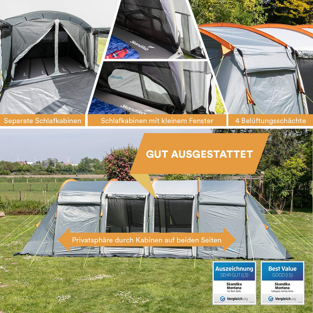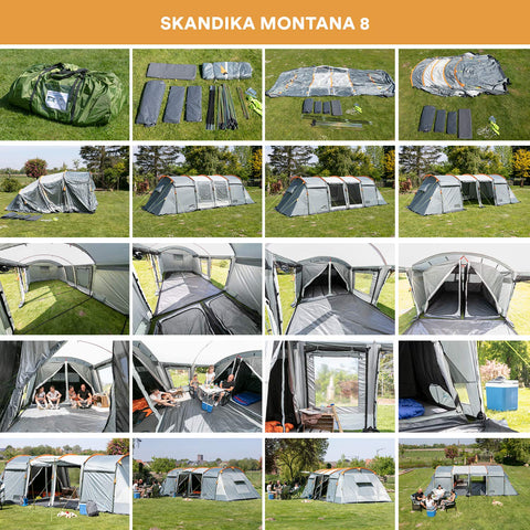 Skandika Montana es una enorme tienda de campaña para 8 personas con tres entradas, con tres dormitorios de tela transpirable, con suelo cosido en forma de bañera y mosquiteras para que duerma cómodamente sin insectos ni corrientes de aire. Esta tienda de campaña familiar cuenta con muchos extras funcionales como la sujeción de la lámpara, bolsillos organizadores en los dormitorios, las aberturas de ventilación y una entrada que se puede utilizar como toldo.